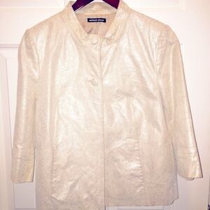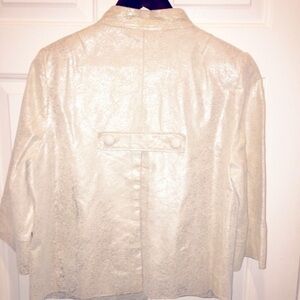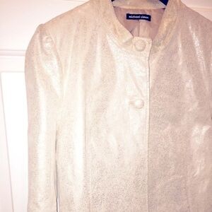 White leather crop sleeve jacket. Chinese collar. Speckle silver through out jacket . Two top buttons. Two front side pockets. Belt design back. Alittle discoloration around neck. Wore Bout 4times. Bought from Neiman Marcus 2yrs ago. Looks amazing with white slacks or jeans!