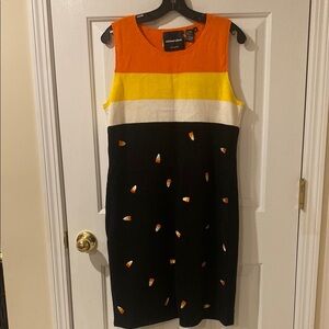 Stand out in this vibrant Michael Simon Halloween dress featuring bold colors of orange, yellow, and black with embroidered candy corn motif.