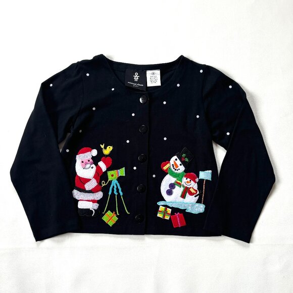 Michael Simon Girl black button top. T-shirt fabric (cotton knit) with applique of Santa with a telescope and snowmen with sequins scattered on the front and sleeves. 2 appliqued presents in back.