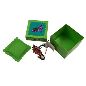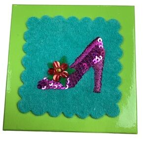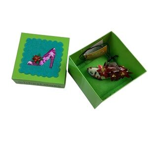 This is a collectors item in a bright green box with a sequined shoe on the cover. The ornament rests on a pillow in the box of the same green color.