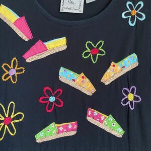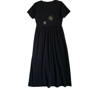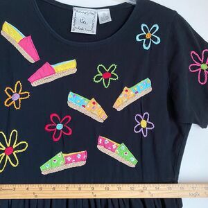 Michael Simon Maxi T-shirt Dress S Black Shoes Embroidered Design Artsy Vacation. 100% cotton. This dress is in great pre-owned condition.