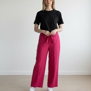 Michael Simon NY Barbiecore Pink Linen Wide Leg Pants P/S, petite small size. Made in USA. Dry Clean only. 100% linen. Tie waist button fly closure, pockets. Approximate measurements: 16" across waist or 32", 12" rise, 27" inseam 39" outseam, 10" wide leg opening, 20" across hip area or 40". Pre-owned in good condition.