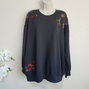 Applique sweater with beading and embroidery detail, padded shoulders, 3/4 sleeve length.
