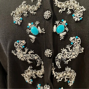 Michael Simon Silk Black Cotton Beaded Cardigan Gecko Frogs Turquoise Medium