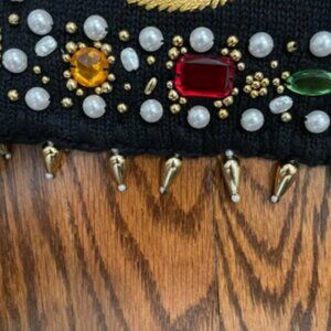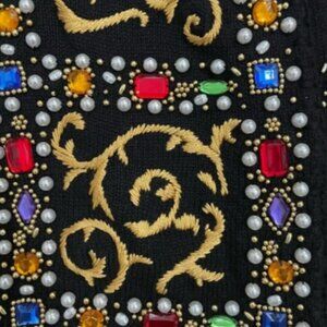 This is a gorgeous vintage cardigan sweater by Michael Simon, circa 1993. It has gorgeous embellishment on the black background with golden yellow embroidery, beads, pearls, large multi-colored stones. Beads fringe along the hem and the beadwork continues down the sleeves and also along the back hem and back collar. There are shoulder pads but they can be cutout if desired, the buttons on the front are hidden. The sweater gives amazing vintage Chanel holiday vibes. It is sized a 2 but seems to run a little large and is a ramie and cotton blend. The sweater is in excellent condition.