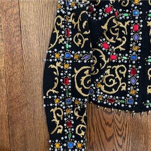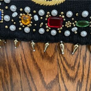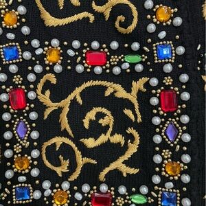 This is a gorgeous vintage cardigan sweater by Michael Simon, circa 1993. It has gorgeous embellishment on the black background with golden yellow embroidery, beads, pearls, large multi-colored stones. Beads fringe along the hem and the beadwork continues down the sleeves and also along the back hem and back collar. There are shoulder pads but they can be cutout if desired, the buttons on the front are hidden. The sweater gives amazing vintage Chanel holiday vibes. It is sized a 2 but seems to run a little large and is a ramie and cotton blend. The sweater is in excellent condition.