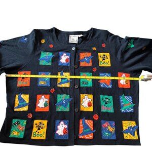 This vintage Halloween cardigan by Michael Simon features intricate applique designs of ghosts, bats, and pumpkins on a black cotton fabric. Ideal for themed gatherings or festive wear.