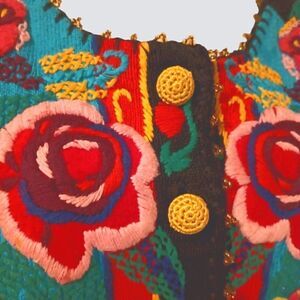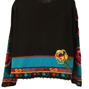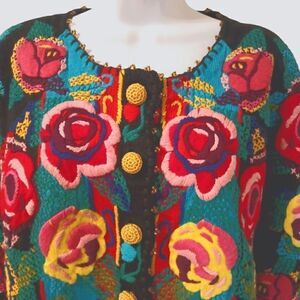 Whimsical colorful vintage 1994 floral embroidered cardigan sweater has appliqued felt roses embroidered and cross stitch details, beautiful bright yellow crochet buttons down front, jewel beading trim around neck, hem, cuffs and down the front, shoulder pads, size 1 = L measures 22" pit to pit 21" long in excellent vintage condition 30 year old sweater see last 2 photos one very faint stain on the back of the left cuff and 1 broken thread in cross stitch on front , all beading is intact