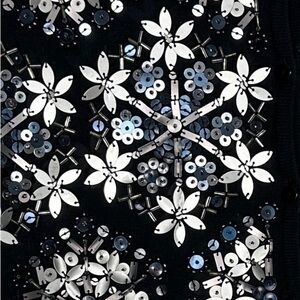 Stunning Michael Simon Workshop size Small heavily embellished snowflake sweater. Black with gray and silver sequins, beads, and other embellishments. Button front cardigan, long sleeve, 100% cotton.