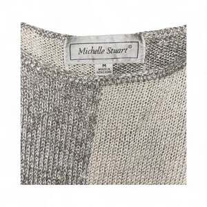 Stylish Michelle Stuart knit top featuring a unique block pattern in varying shades of grey and cream. This comfortable short-sleeve sweater is a versatile addition to any wardrobe, perfect for casual outings or layering. Made in Hong Kong. Excellent pre-owned condition with no significant flaws.