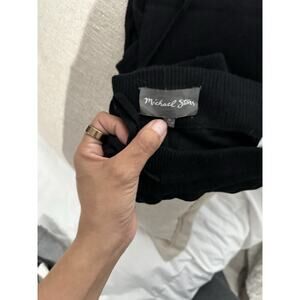 The Michael Stars Black Jogger Pants are a stylish and comfortable option for loungewear, featuring a drawstring closure, elastic waist, and tapered leg style. Made from a luxury blend of cashmere and wool, these pants offer a high rise and come in a classic black color. They are perfect for casual occasions and have a flat front design with slash pockets for added convenience. The jogger style and cuffed hem add a modern touch to these versatile pants, making them suitable for all seasons.