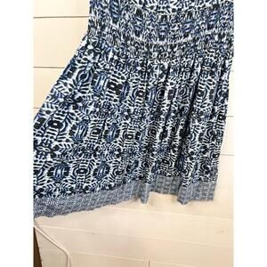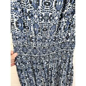 Elevate your wardrobe with this stunning Michael Stars dress. Featuring a vibrant blue geometric pattern, this bohemian dress offers a smocked waist for added style and comfort. Its V-neck and short sleeves make it perfect for casual outings or special occasions.