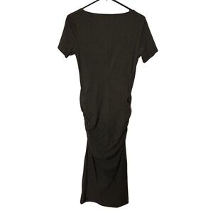 Size Small dark grey Michael Stars short sleeve ruched midi dress featuring a soft and stretchy blend of cotton, modal, and spandex. This flattering style includes side ruching for a body-skimming fit and a draped cowl neckline for an effortlessly chic look.