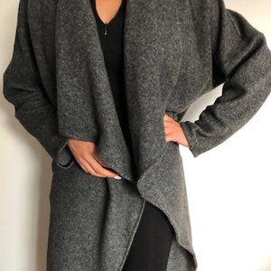 Stylish, warm, and luxurious! Designer is Michael Stars. Very soft wool coat that drapes beautifully open. Slight oversized fit makes it great for layering. Shawl collar. Dark heather grey color. Front pockets. Gently worn and in great condition.