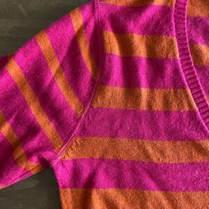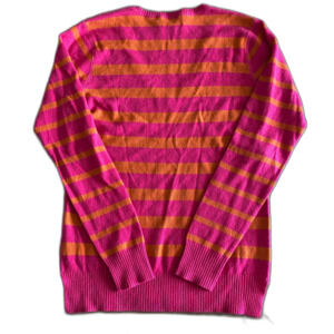 V-neck, ribbed hems, side slit hem, thick stripes in fuchsia pink & orange, dry clean.