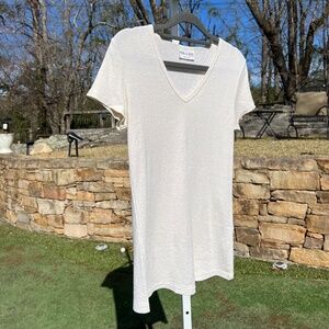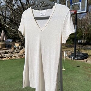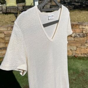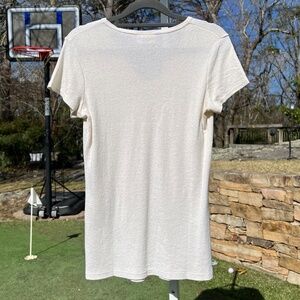 The cream short sleeve, V-neck shirt stretches with you and truly is One Size Fits Most.