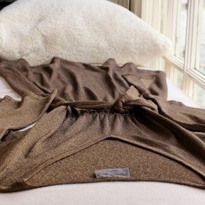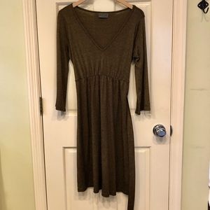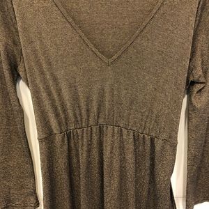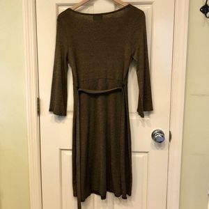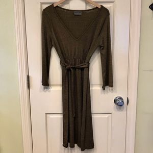 Shimmery bronze V-neck, long-sleeve, knee-length maternity dress with a sash wrap.
