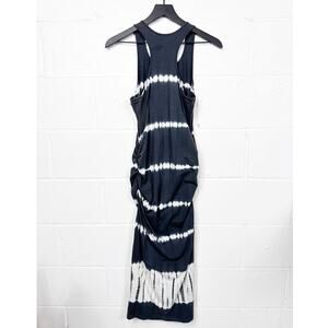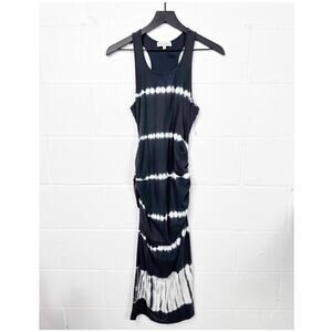Michael Stars tie-dye midi tank dress in black and white. Features ruched sides and a racerback design. Comfortable and stylish for casual or vacation wear.