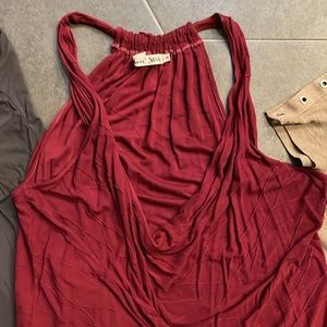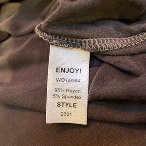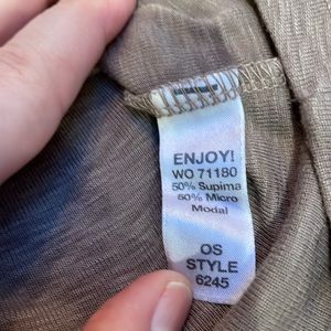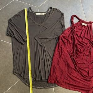 Five tops from Michael Stars. All are considered One Size Fits Most. Khaki T-Shirt is the most form fitting. All these were worn by me when wearing Med/Lg in other shirts. The gray one is pretty flowy with a high low hem. And the Cabernet colored tank has a pattern in the fabric with a cowl neck. Very flattering. If you’d like to purchase just one or two-lmk. Happy to break the bundle up.