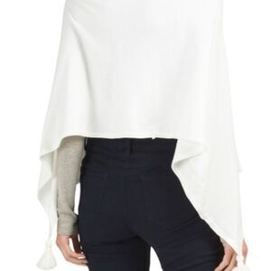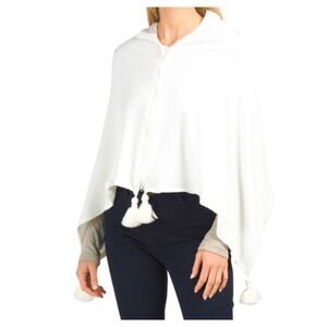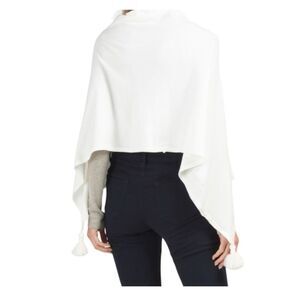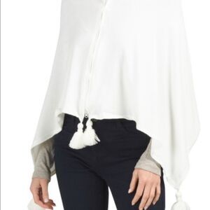 Front zip closure, pom pom accents Poncho sleeve, v - neck Mid - weight knit, asymmetrical hem Rayon / polyester / nylon Imported Dry clean