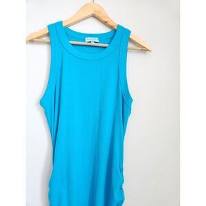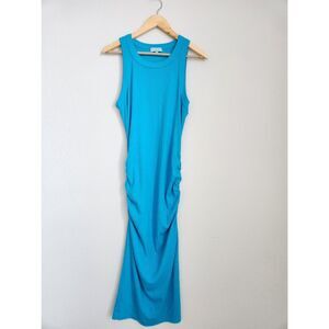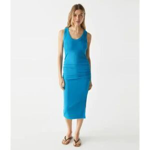 Wide-ribbed fabric adds texture to this casual midi dress featuring a crewneck and cutaway shoulders.