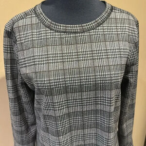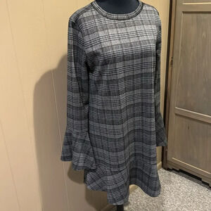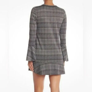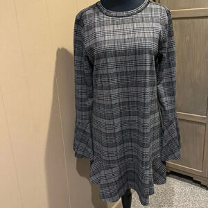 Michael Stars black/white/deep burgundy plaid bell sleeve ruffle hem knit midi. Polyester/rayon/spandex blend. Large. Excellent condition. Nonsmoking home.