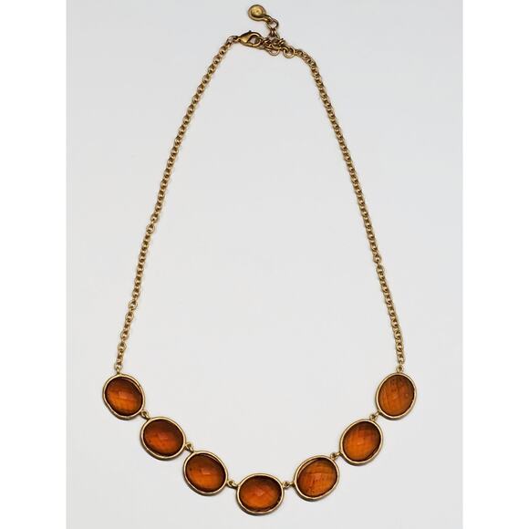 This is a gorgeous Michael Vincent Michaud necklace featuring 7 faceted frosted orange glass cabochons. This statement necklace is beautifully plated in matte 24k gold.