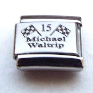 New never worn 9mm stainless steel Italian charm bracelet link with Michael Waltrip 15 and Nascar flags lasered on it.Fits all standard 9mm Italian charm bracelets.Thanks for looking!