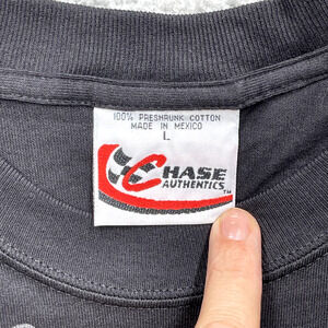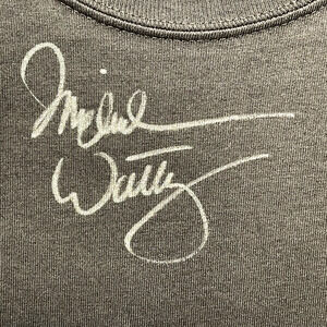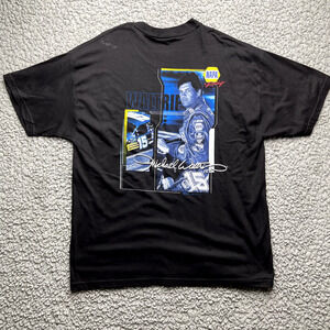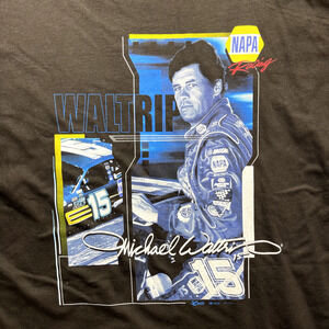 The Michael Waltrip autographed shirt is a men's size large black t-shirt with a solid pattern and short sleeves. Made of cotton with a crew neck and regular fit, this shirt features a Nascar and Napa-themed graphic print, perfect for fans of the 90s racing era. The lightweight knit fabric ensures comfort, while the Chase Authentics branding adds authenticity to this unique piece of memorabilia. Machine washable for easy care, this shirt is a must-have for any racing enthusiast.
