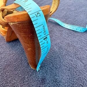 Great pair of very sturdy, chunky, wood-heeled, leather 5 inch heels. These gorgeous shoes have a kind of BoHo/70s style. Nicely broken, in these have been used, but still have a lot of life left in them! There is the remnant of something sticky on the bottom of the left shoe. Wear is reflected in the price.