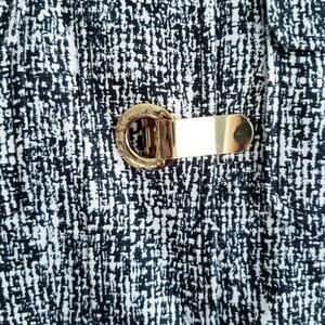 Gorgeous cropped blazer jacket in black/off-white color. Metal clasps are all functional. The top on has some scratches on which is shown on one of the pics. Front breast pockets. 3/4 sleeves. Fully lined