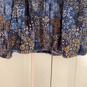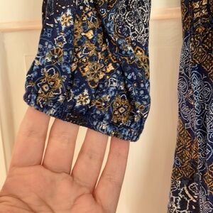 Michael by Michael Kors top in three quarter sleeves. Good used condition top with pretty pattern. Gathered hem on bottom of top and on sleeves for bubble look! Navy and blue and gold accents. Size medium with measurements below.