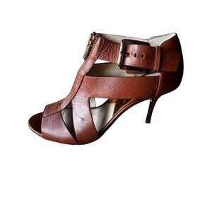 michael kors heels, brown leather shoes, open toe heels, zipper strap heels, buckle strap shoes, women's size 7.5, leather sandals, formal heels, casual brown heels, high heel shoes, medium width footwear, designer women's shoes, stylish leather heels