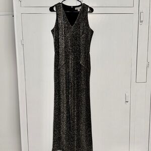 Women’s Size M Michael Kors sleeveless jumpsuit. Light and stretchy. Flared leg. V-neck. Zip back. Shoulder ties. Polyester/metallic/elastane blend. Careful if you have long nails, or anything sharp nearby - this fabric can snag very easily! :)