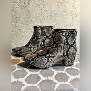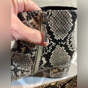 Great block heel, gorgeous faux snake all over. Make a statement with these boots- no doubt. Versatile- pair with jeans, leggings skirts and dress. Awesome gray, black and cream. 8.5