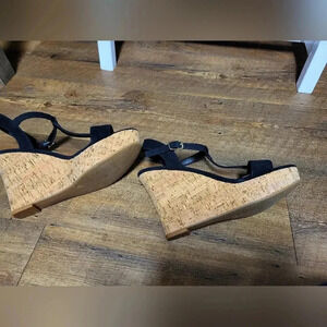 Beautiful black Suede T strap wedge shoes, 4.5 inch heels,