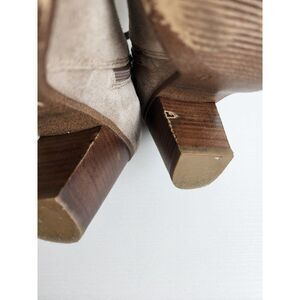 Michael by Michael Shannon Lexi Ankle Boots in Taupe Size 7.5W. No rips, stains or tears detected throughout the leather upper material. A small chip on the inside of one of the block heels, and a few small scratches on the heels as shown in photos. See photos for condition and measurements.