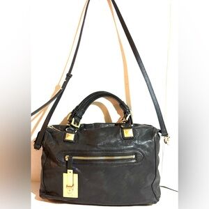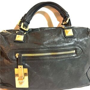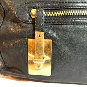 Elegant black distressed leather handbag with gold accents, perfect for any occasion.main compartment 5 pockets at interior wall 1 zip closure zip pocket closure at interior logo lining have some stains marks exterior minor stains is distressed hardware have scratches front closure have missing screw hight 10” wide 13” depth 4.5” strap drop 6” shoulder strap 28” adjustable The dimensions are based on approximately measurements before placing an order please check take a moment to view all photos using feature for a closer look shoulder strap is replaced