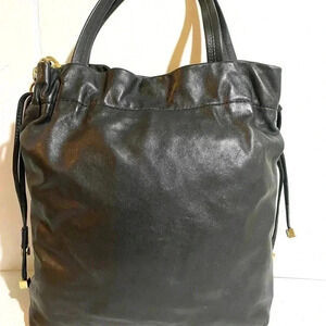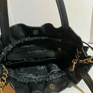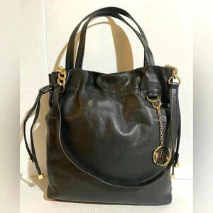 Michael kors black leather shoulder handbag with gold tone hardware main compartment 4 pockets at interior wall 1 zip closure snap closure at top logo at hardware minor scratches hight 15” width 15.5” depth 3.5” strap drop 8” shoulder strap 17” The dimensions are based on approximately measurements before placing an order please check take a moment to view all photos using feature for a closer look
