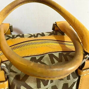 Michael kors MK signature print canvas logo satchel handbag with leather strap & trim with silver tone hardware main compartment 5 pockets at interior wall 1 zip closure & zip closure at top fabric lining 4 protective metal foot lining & exterior have stains marks hardware have some discoloration hight 10.5” width 13.5” depth 4.5” strap drop 8” The dimensions are based on approximately measurements before placing an order please check take a moment to view all photos using feature for a closer look
