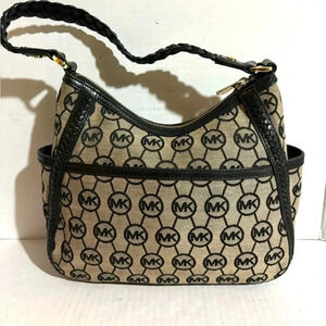 Michael Kors MK signature print canvas shoulder handbag with gold tone hardware main compartment 3 pockets at interior wall 1 zip closure & zip closure at top fabric lining pocket at both side logo at front open pocket at back hight 8” wide 10” depth 2” strap drop 10 The dimensions are based on approximately measurements before placing an order please check take a moment to view all photos using feature for a closer look