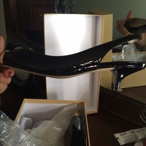 Black and gold patent leather sling backs kitty heels original box and gently worn once