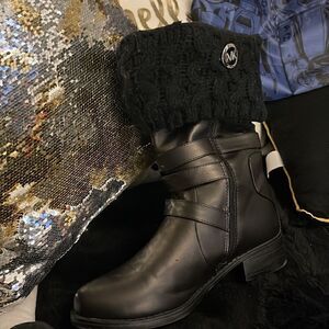 Michael Kors size small, medium black fleece and cable, net boot socks, suitable for ankle to mid calf shaft size boots works great underneath UGGs or heels or flats. Also, you can put these on with the Paris lives just to make a pair of shoes for yourself lol you can also wear these around the house to keep yourself cozy.