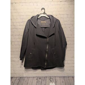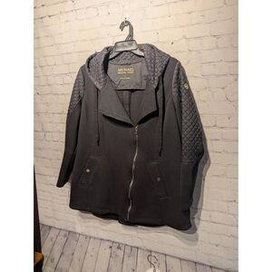 Material content is cotton (55%), polyester and spandex blend. The texture is quilted on the hood and top of sleeves, then soft wool-like feel on the body of the coat. There is also really cool looking full zipper in the back that lets open the back a little bit for a looser fit.