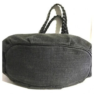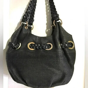 Michael kors back straw shoulder handbag with webbing leather strap and trim with gold tone hardware main compartment 5 pockets at interior wall 1 zip closure fabric lining snap closure at top lining have some stains corners have some cracks exterior have a tear hardware have some tarnishing hight 11.5” wide 17” depth 3” strap drop 13 The dimensions are based on approximately measurements before placing an order please check take a moment to view all photos using feature for a closer look