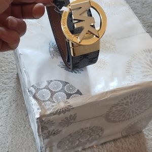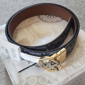 Michael kors ladies medium reversible leather belt . Dark grey mk printed logo on light gray with goldand silver mk metal logo look very nice with pin stud closure .the other side plain brown like 2 belt in One price