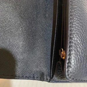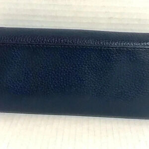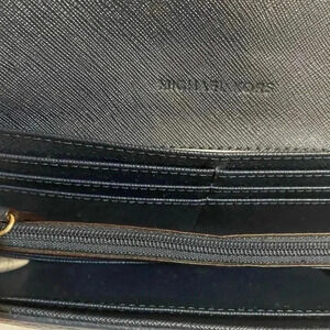 Michael kors navy blue leather wallet main compartment 4 cash slots 10 cards slots zip closure at center jacquard fabric lining MK logo at front snap closure at top crack at center hight 4” width 7.5” depth 1.5” open pocket at back minor stains The dimensions are based on approximately measurements before placing an order please check take a moment to view all photos using feature for a closer look