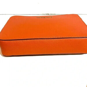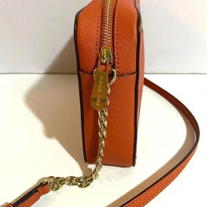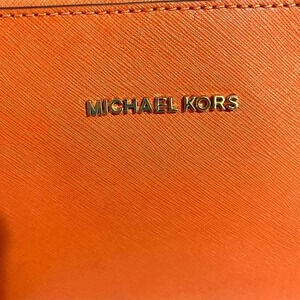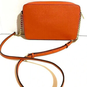 Michael kors orange saffiano leather crossbody handbag with 2 open pockets at interior wall gold tone hardware logo front and hardware minor hight 7” width 9.25” depth 2” strap drop 24” The dimensions are based on approximately measurements before placing an order please check take a moment to view all photos using feature for a closer look