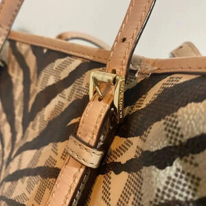 Michael kors print canvas tote handbag with gold tone hardware 3 compartment zip closure at center 5 pockets at interior wall 1 zip closure & zip closure at top jacquard fabric lining beige leather strap & trim hangtag at front lining inside & strap have pin marks & stains logo at hardware back have some discoloration hight 11.5” width 18.5” depth 6.5” strap drop 7” The dimensions are based on approximately measurements before placing an order please check take a moment to view all photos using feature for a closer look