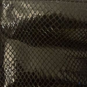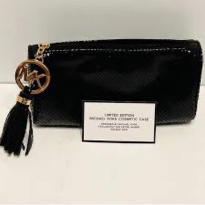 Michael kors MK x estee lauder limited edition LE/SE black patent leather snakeskin cosmetic/makeup bag/clutch -small (7.5 x4.5) w/goldtone bag charm a-keychain & black snakeskin gold banded tassel